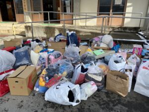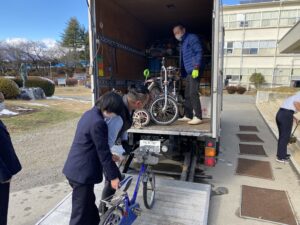 生徒さんや保護者の方々のご協力を得て、家庭での不用品やぬいぐるみ、おもちゃ、そして何台もの自転車や三輪車を譲って頂き、総重量765キロでした!