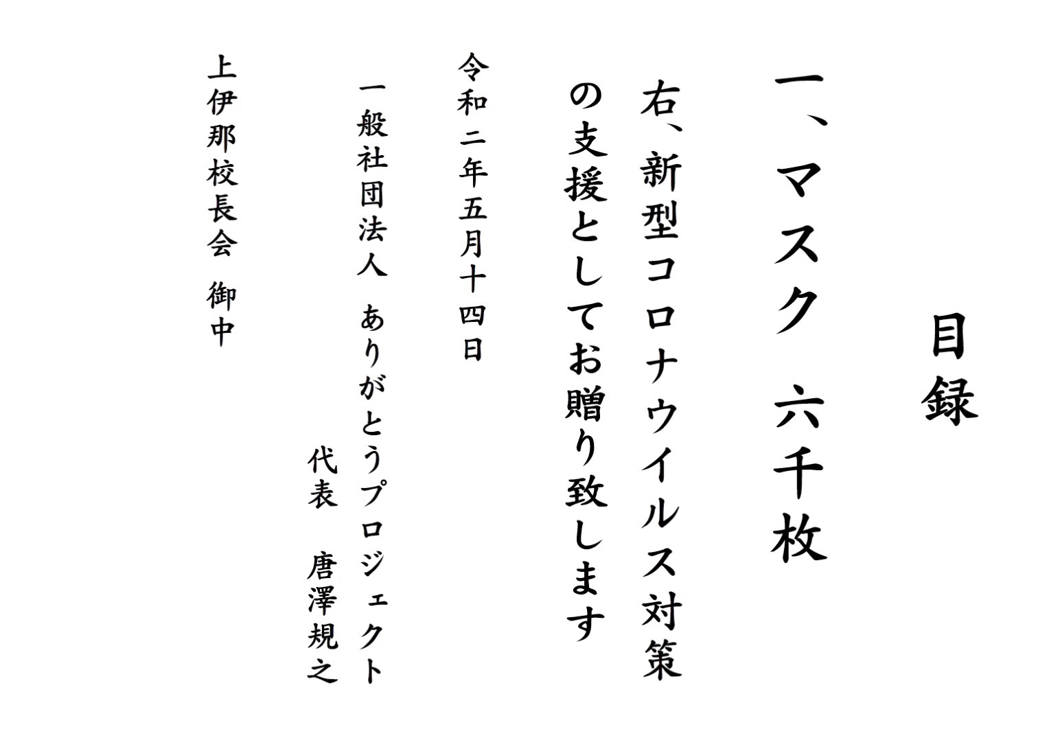 2020年7月17日 / 最終更新日 : 2026年1月8日 ariga_admin ありがとうアルバム 校長会へマスクを送る 2020年5月14日に上伊那校長会様へ新型コロナウイルス対策の支援として、マスク6000枚お贈り致しました。 この投稿はコメントできません。